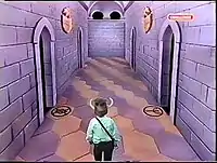 The show was an instant hit, and a second series twice as long as the first was commissioned the next year, closely followed by a third the year after that.[8] By the time this third series finished, Child felt the dungeon format was getting too restrictive, and he needed something new.[9] Because of this, the fourth series saw the introduction of many 'outdoor' scenes, filmed around places such as medieval castles across the UK, and composited into the blue room using the usual chromakey technique.[9] This series also saw the introduction of the "Eye Shield", which acted as an 'eye' for the dungeoneer.[4] Using pre-recorded footage filmed on location, it followed the progress of the dungeoneers as they explored the dungeon.[4] A new onscreen status bar was also introduced, generated by a Commodore Amiga 2000 computer.[10][11]