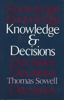 Knowledge and Decisions is a non-fiction book by American economist Thomas Sowell.[1] The book was initially published in 1980 by Basic Books and reissued in 1996.[2] Sowell analyzes social and economic knowledge and how it is transmitted through society, and how that transmission affects decision making. The book's central theme of dispersed knowledge is drawn from F.A. Hayek's article "The Use of Knowledge in Society." Hayek said that this book expanded admirably on his original concepts and made them clear to lay readers, with examples of economic activity drawn from the real world.[3]