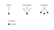 Based on the number of sources and recipients, all types of knowledge transfer can be reduced to 3 subtypes, namely: linear, divergent, and convergent. Linear Knowledge Transfer occurs when there is one source and one recipient ( e.g. when one person explains a specific topic to someone else). Divergent Knowledge Transfer occurs when there is one source and multiple recipients (e.g. when a team leader outlines specific tasks for the team). Convergent Knowledge Transfer occurs when one recipient acquires information from different sources. A typical example of  Convergent Knowledge Transfer is when a patient receives information about a condition from several doctors.  Convergent Knowledge Transfer is especially efficient in producing in-depth knowledge of a specific topic.[20]