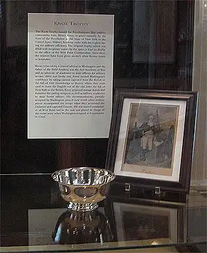 The Knox Trophy is awarded annually prior to commencement ceremonies each year at the USMA at West Point. The award is normally presented by the President or board member of the Sons of the Revolution of the State of New York. A photograph along the annual commencement publication is sent back to the SR Headquarters at the Fraunces Tavern and Museum in New York City. Since the early 1960s, each winner has received a keepsake Tiffany silver Revere bowl. A keepsake replica, alongside a print of General Henry Knox is on display at Fraunces Tavern in lower Manhattan (see image at the top of the piece).