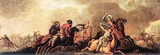 On 4 November the joint Russian forces started the Battle of Praga, after the name of the right-bank suburb of Warsaw where it took place. After four hours of brutal hand-to-hand fighting, the 22,000-strong Russian forces broke through the Polish defences and Suvorov allowed his Cossacks to loot and burn Warsaw.[39]: 210 Approximately 20,000 were murdered in the Praga massacre.[39]: 211 Zajaczek fled wounded, abandoning the Polish army.[39]: 195