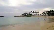 Ko Olina Beach Park is a public park on the west side of the island of Oahu, Hawaii within the Ko Olina Resort Community, part of the City and County of Honolulu. Located at the end of several high-end vacation resorts, the park is situated between the man made lagoon and the Ko Olina Marina. The park's white-sand lagoon is one of four in the 640-acre Ko Olina Resort. The water is well protected by the reef, relatively shallow and the beach bordered by a broad, grassy lawn.[1]