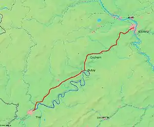 The line leaves Koblenz Hauptbahnhof and diverges from the Left Rhine line, which leads to Cologne, and three km later it crosses the Moselle on the Güls railway bridge. It then runs for about 55 km on the left side of the river to Cochem.