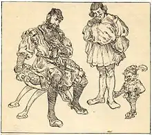 Kobolds who live in human homes are generally depicted as humanlike, dressed as peasants, and standing about as tall as a four-year-old child.[40] A legend recorded by folklorist Joseph Snowe from a place called Alte Burg in 1839 tells of a creature "in the shape of a short, thick-set being, neither boy nor man, but akin to the condition of both, garbed in a party-coloured loose surcoat, and wearing a high-crowned hat with a broad brim on his diminutive head."[41] The kobold Hödekin (also known as Hüdekin and Hütchen) of Hildesheim wore a little hat down over his face (Hödekin means "little hat").[42][43] Another type of kobold known as the Hütchen is said to be 0.3–1 m (0.98–3.28 ft) tall, with red hair and beard, and clad in red or green clothing and a red hat and may even be blind.[44] Yet other tales describe kobolds appearing as herdsmen looking for work[45] and little, wrinkled old men in pointed hoods.[32] Some kobolds resemble small children. According to dramatist and novelist X. B. Saintine, kobolds are the spirits of dead children and often appear with a knife that represents the means by which they were put to death.[46] Heinzelmann, a kobold from the folklore of Hudermühlen Castle in the region of Lüneburg, appeared as a beautiful boy with blond, curly hair to his shoulders and dressed in a red silk coat.[40] His voice was "soft and tender like that of a boy or maiden."[36]
