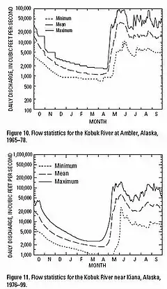 Flow records are available from USGS monitoring stations at Ambler and Kiana. Average annual flow for the Kobuk River at Ambler has ranged from 5,839 cubic feet per second (165.3 m3/s) to 14,890 cubic feet per second (422 m3/s) over the period of record 1966–78, with peak discharge ranging from 30,000 cubic feet per second (850 m3/s) to 95,000 cubic feet per second (2,700 m3/s). Near Kiana, average annual flow has ranged from 10,020 cubic feet per second (284 m3/s) to 24,960 cubic feet per second (707 m3/s) for the period 1977–99 with peaks of 45,000 cubic feet per second (1,300 m3/s) to 161,000 cubic feet per second (4,600 m3/s). Peak flows can result from large volumes of water released when ice jams fail.[3] Flow records are also available for Dahl Creek, a tributary of the Kobuk River with a confluence near the town of Kobuk.