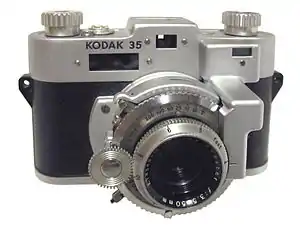 The Kodak 35 Rangefinder is an improved version of the Kodak 35 that was launched by the Eastman Kodak Company in 1938 as their first 35mm camera manufactured in the USA. After some two years, the Company presented this improved Kodak 35 camera, with a new superstructure housing containing a viewfinder and a separate rangefinder, but without any addition to the identifying inscription on the body. It is generally referred to as the Kodak 35 Rangefinder model.