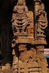 The mandapa or the Rangamantapam, the open-air theatre, has exquisite sculptures. As the mandapa is supported over 32 pillars it is known as Madhyarangaradapam. The colonnades in the mandapa have carved figurines of attendant apsaras (nymphs). The columns of the central support system on the southern side display carvings of the gods Krishna and Vishnu. Each of the corner columns have three layers carved with images of apsaras and deities. In the central part of the mandapa, there are piers which are adorned with images of the mythical creatures yali. The roof of the central part is built up with many decorative brackets or corbels.[3] In one of the columns of the mandapa, images of Rama and his brother Lakshmana are sculpted. Rama is shown here in a standing position with bow in the right hand and arrow in the left hand. Other decorative art depiction in Rama's image consists of Kundalas (ear-rings), haras (garlands), valayas, yagnopavita (sacred thread) and so forth.[6] Lakshmana's figure is sculpted in tribhanga posture with his right hand held down free while the left hand holds a bow. Adornments carved on this image are kirtimukuta (conical crown), graivevakas, channavira, udarbandha (waist band), yagnopavita and purnaruka.[7] Krishna is in dvibhanga posture with the left leg firmly on the ground and the right leg bent at the knee and crossed over the left leg, a style termed as Vyatyastapada. Of his two arms, the right hand is shown holding the Govardhan Hill while the other is rested on kati. The image is ornamented with kirtimukuta and many more other ornaments. Two cows are also depicted by his side.[8]