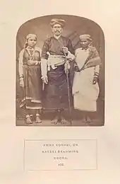 A Kodava woman is called Kodavathi[20] Kodavas have distinctive dresses, the men wearing wraparound robes called the Kupya (now only seen at ceremonial occasions), and the women with a distinctive style of wearing the sari. The Kodava woman wears a sari with the pleats at the back and the loose end pinned at the right shoulder. The men have many distinctive practices such as carrying ceremonial knives, and martial war dances.[21]