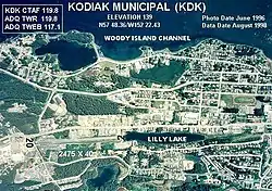 Kodiak Municipal Airport (IATA: KDK[2], ICAO: PAKD[3], FAA LID: KDK) is a city-owned public-use airport located two nautical miles (4 km) northeast of the central business district of Kodiak, a city on Kodiak Island in the U.S. state of Alaska.[1]