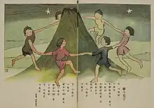 In 1927, Takeo Takei organized a group of illustrators at Kodomo no kuni and co-founded Nihon Dōga Kyokai or the Japan Association of Illustration for Children.[13] Core members of the group included Takei, Shiro Kawakami, Yoshio Shimizu, Kiichi Okamoto, Shōzō Fukazawa, Tomoyoshi Murayama, and Shigeru Hatsuyama, whose distinctive geometric style brought popularized abstraction at the publication.[14] The group was the first of its kind in Japan, specifically organized to further the artistic quality of children's art and illustrations.[10] Nihon dōga kyokai was dissolved in 1941 as a result of wartime policies.[15]