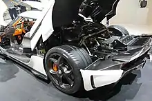 The Regera features a similar suspension layout to the preceding Agera models, with double wishbone suspension at the front and rear axles.[34] The wishbones are manufactured from chrome-molybdenum steel tubes, which was chosen over carbon-fibre due to the significant cost and complexity of the latter option.[35] The suspension incorporates special "Z" shaped anti-roll bars that connect to the body at only one point (as opposed to two for traditional "U" shaped bars). Also returning from the Agera models is Koenigsegg's 'Triplex' damper system, which consists of three custom Öhlins shock absorbers on the rear suspension subsystem.[35] While anti-dive forces under heavy braking are achieved by obliquely mounting the top wishbones in the front of the car, this mounting position could not be achieved in the rear. Therefore, the purpose of the third 'Triplex' rear damper is to provide anti-squat forces under hard acceleration.