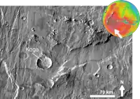 Koga is an impact crater on Mars, approximately 19 kilometers in diameter. It is located at 29.3°S, 103.8°W, north of the crater Virrat and northeast of the crater Dinorwic. To the north is the crater Nhill. It is named after a town in Tanzania, and its name was approved by the International Astronomical Union in 1991.[1][2] According to a surface age map of Mars based on US Geological Survey data, the area around Koga is from the Noachian epoch, which places the area's age at 3.8 to 3.5 billion years ago.[3] Sharp blocks and cliffs poke through a mantle of fine material located at the bottom of the crater.[4] At the deepest part of the crater, it is about 5,200 meters in elevation above zero altitude, and its rim averages about 6,400 meters above zero altitude. It is therefore approximately 1.2 kilometers deep.[2]