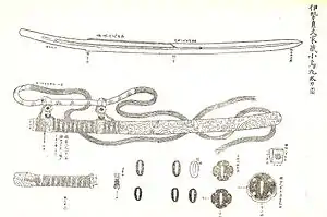 Kissaki Moroha Zukuri (鋒両刃造) blades like the Kogarasu Maru are sometimes referred to as Kogarasu Zukuri (小烏造), since the blade of the Kogarasu Maru is shaped this way and is well known for its distinctive sugata. The Kogarasu Maru is unique as a bridge between the old double-edged Japanese ken (based on the Chinese jian) and the traditional Japanese tachi and eventual katana.