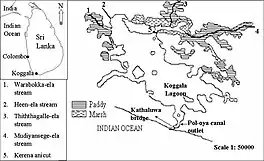![]() Map of Koggala lagoon with the locations of outlet and major freshwater inflows. Suburb marsh and paddy field areas are shown in different shaded patterns[1] | |
