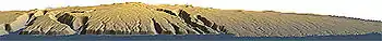 Kohala was devastated by a massive landslide between 250,000 and 300,000 years before present. Debris from the slide was found on the ocean floor up to 130 km (81 mi) away from the volcano. Twenty kilometers wide at the shoreline, the landslide cut back to the summit of the volcano, and is partially, if not largely, responsible for the volcano losing 1,000 m (3,300 ft) in height since then. The famous sea cliffs of the windward Kohala shoreline stand as evidence of the massive geologic disaster, and mark the topmost part of the debris from this ancient landslide.[1] There are also several other unique features found on the volcano, all marks made by the decimating collapse.[3]