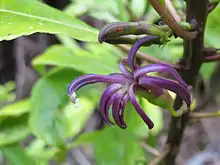 The natural habitats in the Kohala district range across a wide rainfall gradient in a very short distance—from less than 5 in (130 mm) a year on the coast near Kawaihae, to more than 150 in (3,800 mm) a year near the summit of Kohala Mountain, a distance of just 11 mi (18 km). At the coast are remnants of dry forests, and near the summit lies a cloud forest, a type of rainforest that obtains much of its moisture from "cloud drip" in addition to precipitation.[19] These large cloud forests dominate its slopes. This biome is rare, and contains a disproportionate percentage of the world's rare and endemic species.[20] The soil at Kohala is nitrogen-rich, facilitating root growth.[21]