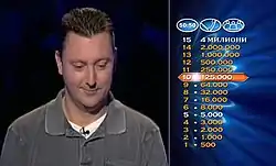 Кој сака да биде милионер? (English translation: Who wants to be a millionaire?, transliteration: Koj saka da bide milioner?) is a Macedonian game show based on the original British format of Who Wants to Be a Millionaire?. The show is hosted by Sašo Macanovski-Trendo. The main goal of the game is to win 4 million MKD (earlier 3 million) by answering 15 multiple-choice questions correctly. There are three lifelines - Fifty Fifty, Phone A Friend and Ask The Audience. Кој сака да биде милионер? originally aired in 2004. It is broadcast on the Macedonian TV station A1. When a contestant gets the fifth question correct, he is guaranteed to leave with at least 5,000 MKD. When a contestant gets the tenth question correct, he is guaranteed to leave with at least 125,000 MKD (earlier 100,000 MKD).