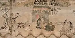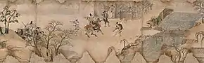 The paintings also observe a regular composition in three planes: a natural foreground (rocks, trees) serving to create depth in the scene; the figures and landscape elements (buildings, roads, fields, etc.) of the story occupying the entire center; and finally a distant and stylized landscape at the top of scroll.[6] This composition is inspired by the canons of Chinese art of the Tang dynasty with typically Japanese variations. The unrealistic perspective is classically based on parallel lines and the point of view is always the same, slightly elevated at the front.[10][11] On the other hand, the lines and outlines in ink are finer and less free than in the other otoko-e works.[12] Here, the lines are characterized by their simplicity; landscape elements are stylised and used mainly to mark transitions between scenes.[13] The narration is based on the repetition of scenes, fundamentally almost unchanged like the representation of the temple or the hunter's hut, in order to illustrate a succession of consecutive events.[6][14]