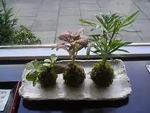 Kokedama (苔玉, in English, literally "moss ball") is a ball of soil, covered with moss, on which an ornamental plant grows. The idea has its origins in Japan, where it is a combination of the nearai (根洗い literally "root wash," but meaning "no pot") bonsai and kusamono planting styles. Today, Kokedama is very popular in Japanese gardens.