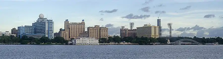 The Kolkata metropolitan area is spread over 1,886.67 km2 (728.45 sq mi)[66]: 7 and comprises 4 municipal corporations (including Kolkata Municipal Corporation), 37 local municipalities and 24 panchayat samitis, as of 2011.[66]: 7 The urban agglomeration encompassed 72 cities and 527 towns and villages, as of 2006.[67] Suburban areas in the Kolkata metropolitan area incorporate parts of the following districts: North 24 Parganas, South 24 Parganas, Howrah, Hooghly and Nadia.[68]: 15 Kolkata, which is under the jurisdiction of the Kolkata Municipal Corporation (KMC), has an area of 206.08 km2 (80 sq mi).[67] The east–west dimension of the city is comparatively narrow, stretching from the Hooghly River in the west to roughly the Eastern Metropolitan Bypass in the east—a span of 9–10 km (5.6–6.2 mi).[69] The north–south distance is greater, and its axis is used to section the city into North, Central, South and East Kolkata. North Kolkata is the oldest part of the city. Characterised by 19th-century architecture and narrow alleyways, it includes areas such as Jorasanko, Rajabazar, Maniktala, Ultadanga, Shyambazar, Shobhabazar, Bagbazar, Cossipore, Sinthee etc. The north suburban areas like Dum Dum, Baranagar, Belgharia, Sodepur, Khardaha, New Barrackpore, Madhyamgram, Barrackpore, Barasat etc. are also within the city of Kolkata (as a metropolitan structure).[68]: 65–66 Central Kolkata hosts the central business district. It contains B. B. D. Bagh, formerly known as Dalhousie Square, and the Esplanade on its east; Rajiv Gandhi Sarani is on its west.[70] The West Bengal Secretariat, General Post Office, Reserve Bank of India, Calcutta High Court, Lalbazar Police Headquarters and several other government and private offices are located there. Another business hub is the area south of Park Street, which comprises thoroughfares such as Jawahar Lal Nehru Road, Abanindra Nath Tagore Sarani, Dr. Martin Luther King Sarani, Dr. Upendra Nath Brahmachari Sarani, Shakespeare Sarani and Acharay Jagadish Chandra Basu Road.[71] South Kolkata developed after India gained independence in 1947; it includes upscale neighbourhoods such as Bhawanipore, Alipore, Ballygunge, Kasba, Dhakuria, Santoshpur, Garia, Golf Green, Tollygunge, New Alipore, Behala, Barisha etc. The south suburban areas like Maheshtala, Budge Budge, Rajpur Sonarpur, Baruipur etc. are also within the city of Kolkata (as a metropolitan structure).[22] The Maidan is a large open field in the heart of the city that has been called the "lungs of Kolkata"[72] and accommodates sporting events and public meetings.[73] The Victoria Memorial and Kolkata Race Course are located at the southern end of the Maidan. Among the other parks are Central Park in Bidhannagar and Millennium Park on Rajiv Gandhi Sarani, along the Hooghly River.