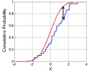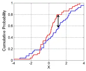 where supx is the supremum of the set of distances. Intuitively, the statistic takes the largest absolute difference between the two distribution functions across all x values.