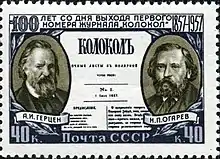 Kolokol (Russian: Колоколъ, lit. 'bell') was the first Russian censorship-free weekly newspaper in Russian and French languages, published by Alexander Herzen and Nikolai Ogarev in London (1857–1865) and Geneva (1865–1867). It had a circulation of up to 2500 copies. Despite being banned in Russia, it was well known and had a significant influence on the reformist and revolutionary movements of the 1860s.[1]