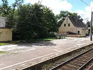 The station consists of two side platforms and main building used for signalling control. The cash office was closed in 2015. A passage between platforms is provided through secured road crossing located next to the station.[2]