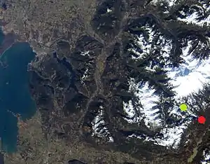 ![]() Image of project on Mount Baker as seen from space: red dot is powerhouse, green dot is dam(s). Bellingham on the upper left side of frame, Lake Shannon on lower right. | |