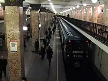 Komsomolskaya (Russian: Комсомо́льская) is a Moscow Metro station in the Krasnoselsky District, Central Administrative Okrug, Moscow. It is on the Sokolnicheskaya line, between Krasnye Vorota and Krasnoselskaya stations. It is located under Komsomolskaya Square, between the Leningradsky, Yaroslavsky, and Kazansky railway terminals. The station was named for the workers of the Komsomol youth league who helped to construct the first Metro line. It has a transfer at its namesake on the Koltsevaya line.