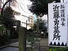Another grave is located on the memorial known as Grave of Shinsengumi, in front of Itabashi Station near the location of former Itabashi execution grounds. It was erected in 1875 by Nagakura Shinpachi, with the help of Matsumoto Ryōjun and several surviving former Shinsengumi members including Saitō Hajime. It memorializes Kondō and Hijikata Toshizō.