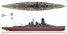 Kirishima's keel was laid in Mitsubishi's Nagasaki yard on 17 March 1912. She was launched about a year and a half later (1 December 1913) and transferred to Sasebo Naval Arsenal for fitting out. After her completion on 19 April 1915, she served off Japan, China and Korea's coasts during the First World War. After the war, she alternated between being based in Japan and patrolling off Japanese ports. On 14 September 1922, she collided with the destroyer Fuji, causing minor damage to both ships.[47] Kirishima also assisted rescue efforts in the aftermath of the devastating 1923 Great Kantō earthquake, which destroyed most of Tokyo. After being sent to the reserve fleet in December 1923, she received a refit during 1924. Returning to the main fleet, the battlecruiser operated off China for periods of time in 1925–1926, until she returned to reserve from 1927 to 1931 in preparation for a major reconstruction.[N 4] Her superstructure was rebuilt, and she received extensive upgrades to armour, propulsion, and waterline bulges. After a period of fleet duty in the early 1930s, she underwent a two-year reconstruction (1934–1936) to rebuild her as a Fast Battleship.[47] This upgrade improved her engine plant, redesigned the superstructure, lengthened the stern, and enabled her to equip floatplanes. After serving as a transport and support-ship during the Second Sino-Japanese War, Kirishima escorted the aircraft carrier strikeforce bound for the attack on Pearl Harbor in December 1941. Following the start of World War II, Kirishima served as an escort during carrier attacks on Port Darwin and the Dutch East Indies.[7] Kirishima joined her sister ships in escorting naval sorties against Ceylon.[48] She once again served escort duty during the disastrous Battle of Midway, before transferring to Truk Lagoon in preparation for operations against American landings on Guadalcanal. After participating in the Battles of the Eastern Solomons and Santa Cruz, Kirishima joined Hiei in a night attack on 13 November 1942. Following the loss of the latter on the evening of 13 November, Kirishima subsequently engaged American battleships on the night of 14/15 November. She managed to inflict superficial damage on USS South Dakota, but she was in turn caught off guard while attacking South Dakota and was crippled by USS Washington.[46] With her engines largely disabled and listing heavily to starboard, Kirishima was abandoned in the early morning of 15 November 1942. She capsized and sank at 03:25 with the loss of 212 of her crew.[47]