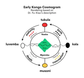 The creation of a Bakongo person, or muntu, is also believed to follow the four moments of the sun, which play a significant role in their development.[2] Musoni is the time when a muntu is conceived both in the spiritual realm and in the womb of a Bakongo woman. Kala is the time when a muntu is born into the physical world. This time is also seen as the rising of the sun. Tukula is the time of maturity, where a muntu learns to master all aspects of life from spirituality to purpose to personality. The last period of time is luvemba, when a muntu physically dies and enters the spiritual world, or Nu Mpémba, with of the ancestors, or bakulu.[2][6] Because Bakongo people have a "dual soul-mind," or mwèla-ngindu, they are able to exist and live in both realms during the different moments of their lives. Even while in Nu Mpémba, a muntu still lives a full life as they prepare for Kala time once again.[2] The right side of the body is also believed to be male, while the left side is believed to be female, creating an additional layer to the dual identity of a muntu.[5]