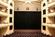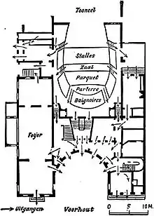The main room of the Schouwburg is relatively small for current standards,[3] and can seat 680 people in total with the main room and three balconies.[4] The stage has a 1929 antique revolving stage that is still functional but no longer in use.[3] It is considered one of the most prestigious theaters in the country.
