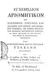 ![]() Cover of Εγχειρίδιον αριθμητικής (Manual of Mathematics), printed in Halle, 1769 | |