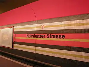 It was opened on 28 April 1978 (architect R.Rümmler)[2] with the line's extension to Richard-Wagner-Platz. The eponymous street is named after the town of Konstanz (Constance). The colors of the tiles on the wall of this station are also found in the emblem of the city Konstanz.