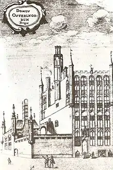 The Hansards rented the Oosterlingenhuis ("Easterling house", it refers to Germans) from 1442 as their own guildhall. In 1478 its new guildhall buildings at the Oosterlingenplein were completed. But the kontor continued to use the canteen of the monastery of the Carmelite order.[1]: 139–140 The monastery hasn't survived, while the façade of the Oostenlingenhuis doesn't exist anymore. [3]: 181, 184