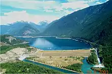 Solely built for the purpose of regulating water flow into Kootenay Lake, Duncan Dam, the first dam built for the treaty, was raised in 1967 and increased the 25-kilometre (16 mi) long size of Duncan Lake to a reservoir 45 kilometres (28 mi) long.[120] Because of its purpose, it has no power generation facilities.[121] Libby Dam, the fourth and last dam built under the treaty, was completed in 1975 by the U.S. Army Corps of Engineers.[122] The other two dams built for the treaty, Keenleyside and Mica, are both on the Columbia River.[121] Kootenay basin reservoirs provide nearly 8.6 cubic kilometres (7,000,000 acre⋅ft) of storage which constitutes almost half of the 19.1 cubic kilometres (15,500,000 acre⋅ft) stored in Columbia River Treaty reservoirs.[123][124]