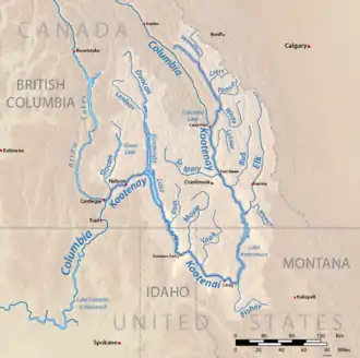 ![]() Map of the Kootenay River, its main tributaries and lakes, and major cities. | |