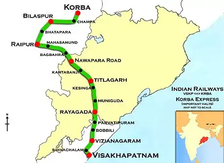 The Korba-Visakhapatnam Express is a daily train in India that runs between Korba in Chhattisgarh and Visakhapatnam in Andhra Pradesh, travelling through much of Odisha. It began to operate in 1989. The route is 731 km long and passes through 31 stations.[1]