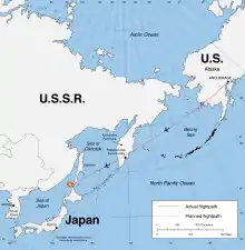 Upon KAL 007’s arrival over Bethel, its flight plan called for it to take the northernmost of five 50-mile-wide (80 km) airways, known as the NOPAC (North Pacific) routes, that bridge the Alaskan and Japanese coasts. That particular airway, R20 (Romeo Two Zero), passed as close as 20 miles (32 km) from what was then Soviet airspace off the coast of the Kamchatka Peninsula.