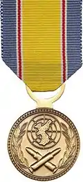 While a number of countries accepted the medal, at the time of the Korean War Service Medal's presentation to UN troops the United States of America declined to award the medal to US soldiers. This was based on regulations of the time which curtailed the acceptance and wear of foreign decorations on US military uniforms; the US Congress changed the law on May 8, 1954.[7] Although subsequently some veterans attempted to have the award accepted, the Korean War Service Medal faded into history after the war and was not heard of again until 1996. At that time the Army noted that it could find no record that the South Korean government ever offered the medal to the Department of Defense. This was technically true since the original offer was made to the United Nations Command. The Army took the position that unless the South Korean government resurrected their original offer, it was "not in a position to officially recognize or approve acceptance of the medal."[8] Although some photographs show the Korean War Service Medal displayed with a Taeguk on the suspension ribbon of the medal, this is not authorized and indicates that it is a photo of a reproduction medal.