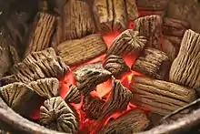 Gogi-gui comes with various banchan (side dishes). The most popular side dishes are rice[10] and kimchi,[11] and a green onion salad called pajeori and a fresh vegetable dish including lettuce, cucumbers, and peppers invariably accompany the meat dishes at restaurants. Other popular side dishes include the spinach side dish (sigeumchi namul/시금치나물), egg roll omelette (gyeran-mari/계란말이), spicy radish salad (mu saengchae/무생채),[12] and a steamed egg soufflé (gyeran-jjim/계란찜).[13] A popular way of eating Korean barbecue is to wrap the meat with lettuce and/or perilla leaves and add condiments such as pajeori (spicy scallion salad) and ssamjang (a spicy paste made of doenjang mixed with gochujang).[14]