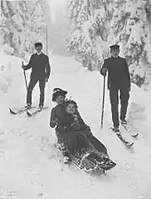 In 1898, the Holmenkollen Line was opened to Besserud. One of the line's main revenue sources was transporting city-dwellers to the recreational area of Nordmarka where they would go skiing.[4] An alternative activity was tobogganing down the hill back to Majorstuen.[5] The operator Holmenkolbanen immediately started plans to extend the line. There were two proposals: a continuation of the line past Holmenkollen and a branch from Midtstuen up Korketrekkeren to Frogneseteren. However, the latter required the use of a rack railway, as it would give a 1:8 gradient.[4] The former route was selected and the line was extended to Frogneseteren in 1916.[6] Holmenkolbanen started renting out sleds at Frogneseteren, which could be returned at most stations. To save the return ticket, many chose to continue the tobogganing ride to Majorstuen.[7]