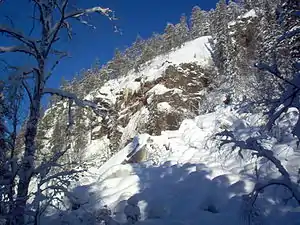 At the centre of Korouoma the fracture valley forms a gorge which has worn down and become much deeper than the surrounding terrain. The walls of the gorge are cliff faces which are tens of metres high and extremely steep. Small streams which cascade down the cliff faces freeze into icy water falls during winter. They stay frozen till late spring.