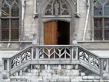 In 1807, during the French occupation, the statues and their canopies were removed and the front was flattened out according to the spirit of the age. Around 1850 the front was renovated, but not too successfully. Even while in progress, the artistic value of the restoration was questioned. In 1854, the festive hall was fitted up on the occasion of a visit by king Leopold II and the Queen.