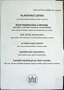 In 2013 Czech presidential election, the first direct presidential election in the country, KČ boycotted the election, as it was contrary to its goal of unelected head of state. At the same time, an independent monarchist candidate, sculptor Emil Adamec announced his candidacy, but he failed to gather enough signatures of citizens to become a candidate. Some members of KČ supported him,[5] while others urged the party to support the candidacy of Karel Schwarzenberg as an aristocrat and a personal friend of the royal house. KČ remained neutral, but issued a statement that is monarchists want to participate, then Schwarzenberg is the best choice.[6] Some KČ members also created mock ballots for Karl von Habsburg as an heir to the throne, which garnered some media attention.[7][8]