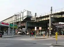 This elevated station has two side platforms and three tracks; the center express track is not used in regular service.
