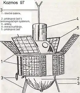 Kosmos 135 (Russian: Космос 135 meaning Cosmos 135), also known as DS-U2-MP No.1, was a Soviet satellite which was launched in 1966 as part of the Dnepropetrovsk Sputnik programme. It was a 355 kilograms (783 lb) spacecraft,[1] which was built by the Yuzhnoye Design Office, and was used to investigate micrometeoroids and particles of dust in space.[3]