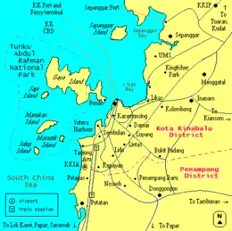 The city is defined within the borders of what is the district, formerly the municipality, of Kota Kinabalu. With an area of 351 square kilometres, it is the smallest but the most populous district in Sabah.[33] It encompasses Tanjung Aru and Kepayan in the south, up to Telipok and Sepanggar in the north. The urban expanse of the city however extends into the district of Penampang[34] on the south of the city border, which includes the towns of Donggongon and Putatan. The combined area of Kota Kinabalu District and the contiguous built up areas in Penampang and Putatan is known as Greater Kota Kinabalu.[35] The district of Penampang has an area of 466 square kilometres, and is administered by Majlis Daerah Penampang (Penampang District Council).[36]