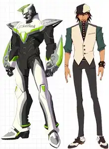 Kotetsu T. Kaburagi was created to be an unconventional anime main character due to notable facial hair and him being far older in contrast to younger heroes. As a result, the series was created to appeal to an older audience. While Kotetsu and Barnaby bond for the series' entire run, there was an agreement to focus on a build up during the first half. Kotetsu and Barnaby's relationship is one of the main themes of the television series alongside Kotetsu's attitude of never giving up. Producer Masayuki Ozaki felt he related to Kotetsu the most within the series' all heroes due to their close age during 2011.[1] Each of the heroes in the series is sponsored by fictional and non-fictional companies. These include large brands with Apollon Media and S.H. Figuarts promoting Kotetsu.[2]